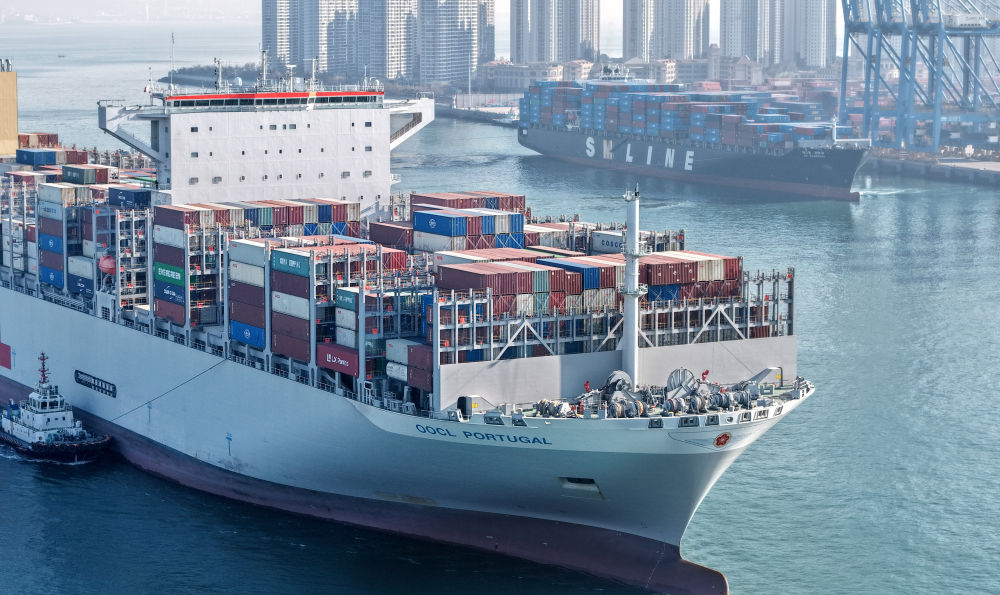 2025年12月4日,貨輪進(jìn)出山東港口青島港前灣港區(qū)(無人機照片)。新華社記者 李紫恒 攝